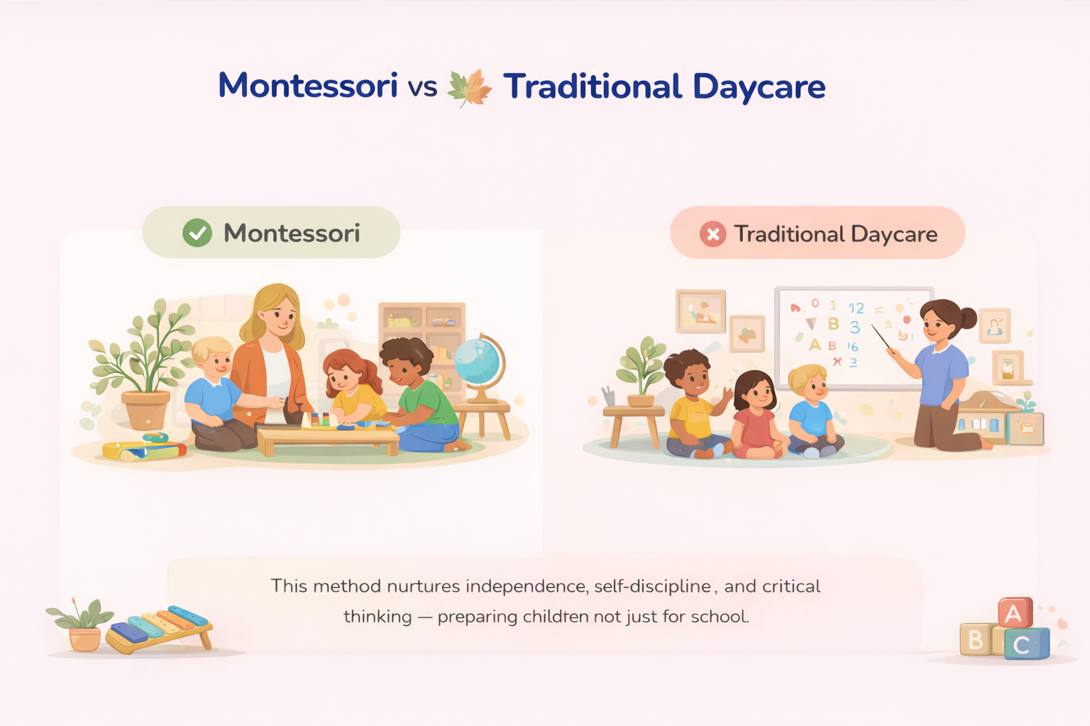In a Montessori classroom, children learn at their own pace using specially designed materials that encourage exploration and discovery. Teachers act as guides, supporting each child’s unique learning journey.